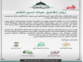 جبهة النصرة وحركة نور الدين الزنكي وجيش السنة وجبهة أنصار الدين ولواء الحق يعلنون تشكيل تنظيم عسكري جديد تحت مسمى "هيئة تحرير الشام" بعد فشل الاتفاق بين الفصائل المسلّحة وجبهة النصرة التي رفضت في بيان لها اقتراح حركة "أحرار الشام" توحيد الفصائل ورأت أن الحل يكون بتوحيد قرار الحرب والسلم على الساحة كلّها.أعلنت كل من جبهة النصرة وحركة نور الدين الزنكي وجيش السنة وجبهة أنصار الدين ولواء الحق تشكيل تنظيم عسكري جديد تحت مسمى "هيئة تحرير الشام".وقد أعلنت الفصائل المندمجة تحت اسم "هيئة تحرير الشام" أنها ستكون بقيادة المدعو "أبو جابر هاشم الشيخ".وبحسب مصادر في المعارضة المسلحة فإنّ أبو جابر الشيخ هو عضو مجلس الشورى في حركة أحرار الشام وقائد الحركة سابقاً، ولفتت بعض تنسيقيات المسلحين إلى أنّ أبو جابر الشيخ انشقّ مع مجموعة من حركة أحرار الشام لإعلان تشكيل هيئة تحرير الشام.وكانت "جبهة النصرة" رفضت في وقت سابق توحيد الفصائل المسلّحة الذي دعت إليه حركة"أحرار الشام" معتبرة أنه ليس الحلّ الأمثل لوقف الاقتتال في ما بينها.وجاء بيان النصرة بالتزامن مع إعلان تنسيقيات المسلحين فشل التوصل إلى اتفاق خلال الاجتماع الذي جمع أمير الجبهة أبو محمد الجولاني مع عدد من قادة الفصائل في الشمال السوري. وقالت النصرة في بيانها إن "الحل يكون بوضع كل المقدّرات تحت قيادة واحدة تذوب فيها أغلب الفصائل تحت قيادة أمير واحد" وبالتالي "توحيد قرار السلم والحرب للساحة ككل" معتبرة أن "التجمعات الفصائلية أثبتت فشلها أكثر من مرة ومن العبث أن نعيد تلك التجارب" وفق تعبيرها.وذكرت تنسيقيات المسلحين أن الجولاني عرض اندماج أحرار الشام وحركة نور الدين الزنكي والنصرة، ونقلت عن الجولاني تصميمه على الاستمرار بـ"مشروع التغلب" ومواصلة عدوانه.   وتواصلت المعارك بين الفصائل المسلّحة في شمال سوريا حيث اقتحمت جبهة النصرة مقرات جيش الإسلام في قرية بابسقا في ريف إدلب الشمالي فيما تحدثت تنسيقيات المسلحين عن اشتباكات بين النصرة وصقور الشام التي أعلنت كتيبة "نور الإيمان" التابعة لها في قرية معترم بريف إدلب الجنوبي الإنشقاق عنها وتسليم مقراتها للنصرة.شورى أهل العلم": الفصائل في إدلب تمرّ بأخطر حلقات مسلسل النصرة الاجرامي"في غضون ذلك أطلق مجلس شورى أهل العلم في الشام "مبادرة لإنقاذ الشمال السوري" واصفاً قتال جبهة النصرة للفصائل المسلّحة بـ"العدوان".المجلس الذي أعلنت "صقور الشام" دعمها مبادرته والتزامها به قال "إن الفصائل المسلّحة تمرّ بأخطر حلقات مسلسل النصرة الإجرامي". انشقاق في صفوف الزنكيهذا وأعلن "القطاع الشمالي" لحركة نور الدين الزنكي في ريف حلب الشمالي انشقاقه عن الحركة وانضمامه إلى ما يسمى "فيلق الشام". -  المصدر: تويتر-  الميادين نترصد || أعلنت مجموعة من قادة المسلحين مبايعتها لتنظيم "هيئة تحرير الشام" بقيادة تنظيم "جبهة النصرة" عرف منهم حتى اللحظة :ابو سراقة العراقيابو اليقظان المصري "شرعي سابق بميليشيا احرار الشام" طلحة الميسر "شرعي سابق بميليشيا احرار الشام" سراقة المكي عبد الله المحيسني "سعودي الجنسية"ابو عبدالملك الشاميعبد الرزاق المهديابو حارث المصريابو يوسف الحمويابو طاهر الحمويفيما أعلن "مجاهدو اشداء" الانضمام الى التشكيل الجديد الذي بات يضم عشرات القادة الأجانب بالإضافة لقادة تنظيم "جبهة النصرة" سابقاً