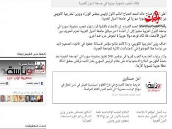 تناقلت عدة مواقع عربية خبراً بعنوان “إلغاء تجميد عضوية سوريا في الجامعة العربية”، ونسبت إعلان الإلغاء لـ “الشيخ صباح خالد الحمد الصباح” وزير الخارجية الكويتي.الخبر وما تضمنه من تصريحات، ملفق بالكامل ولا صحة له على الإطلاق.الناشر الأول للأخبر هو موقع “وناسة مصرية أونلاين”، قام بنشر الخبر الملفق يوم السبت (6/5)، بواسطة “امل حسناوي”، وعرف عنها بالقول إنها “خريجة جامعة كامبردج في فرع العلوم السياسية تعيش في لندن تعمل في موقع وناسه مصرية في قسم اخبار العالم كمراسلة”.نص الخبر " أعلن الشيخ صباح خالد الحمد الصباح النائب الأول لرئيس مجلس الوزراء ووزير الخارجية الكويتي عن إلغاء تجميد عضوية سورية في جامعة الدول العربية.وقال الشيخ صباح خالد الحمد الصباح: “إن الأعضاء ناقشوا قرار إنهاء تجميد عضوية سورية في جامعة الدول العربية، مشيراً إلى أن المادة 5 من ميثاق جامعة الدول العربية تحرّم الحروب بين الدول الأعضاء فلا تكاد توجد دولة عربية لا تخوض حرباً ضد أخرى”.وأضاف وزير الخارجية الكويتي: “إذا كانت نتائج مؤتمر الأستانة خطوة في الاإجاه الصحيح لابد من دراسة هذا الموضوع في الاجتماعات الآتية للجامعة العربية”.وكان وزراء الخارجية العرب قرروا في تشرين الثاني 2011 تعليق عضوية سورية في الجامعة العربية بعد بضعة أشهر من اندلاع الاحتجاجات على الحكومة السورية."