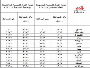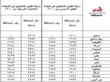 إلى مديرية التربية في محافظة :يجري القيد والقبول في الصف الأول الثانوي في المدارس الرسمية العامـة والمهنيـة والخاصـة والمستولى عليها ومـا في حكمها بدءاً من يوم الأثنين في 3 / 7 /2017 حتى غاية يوم الخميس في 31/ 8 / 2017م وذلك للطلاب الناجحين والناجحات في شهادة التعليم الأساسي أو الشهادة الإعدادية الشرعية لدورة عام 2017م .أولاً: القيد والقبول في المدارس الثانوية المهنية : يقبل في الصف الأول الثانوي المهني الناجحون في شهادة التعليم الأساسي لدورة عام 2017م من كل محافظة وفق الآتي :1 - جميع الطلاب الراغبين من كافة المواليد من المقبولين في التعليم الثانوي العام .2 - جميع الطلاب من مواليد : 1998 – 1999- 2000م مهما كان مجموع درجاتهم . 3 - جميع الطلاب من مواليد : 2001- 2002- 2003- 2004م ممن حصلوا على الدرجات المحددة وما دون في شهادة التعليم الأساسي أو في الشهادة الإعدادية الشرعية وفق الآتي : المحافظة درجة القبول للناجحين في شهادة التعليم الأساسي من 3100 درجة القبول للناجحين في الشهادة الإعدادية الشرعية من 4200 آخذين بالاعتبار تطبيق نفس الدرجة المحددة لمركز المحافظة عند تسجيل الطلاب الأحرار.4- يتم قبول الطلاب في التعليم الثانوي المهني ( صناعي – تجاري – نسوي) حسب رغبتهم من خلال مفاضلة الدرجات لجميع المسجلين وفـق الطاقة الاستيعابية للمدارس والمهن على أن تطبق التعليمات الوزارية المتعلقة بمعايير الخريطة المدرسية . مع مراعاة تحقيق التوازن بين أعداد المقبولين في التعليم الثانوي المهني التجاري للذكور والإناث بما يعادل نسبة (50 %) لكل منهما دون التأثير على المهن الأخرى . ويتم إنـجاز عمليـات فرز الطلاب قبل بدء العام الدراسي .5- يسجل الطالب أو الطالبة في المحافظة التي حصل منها على شهادة/ التعليم الأساسي- الإعدادية الشرعية/حصراً باستثناء طلاب محافظة الرقة. 6- تحدد أعداد الطلاب الناجحين في شهادة التعليم الأساسي في مركز المحافظة للقبول في التعليم الثانوي المهني وفق الدرجة المحددة لمركز المحافظة ومدنها .7- في حال وجود مدرسـة أو أكثر للحلقة الثانية من مرحلة التعليم الأساسي في قريـة تحدد درجة القبول لنسـبة 30 % من الناجحين في شهادة التعليم الأساسي من مجموع أعداد الطلاب الناجحين في تلك المدارس بما لا يتجاوز الحد الأعلى للدرجة المحددة لريف المحافظة أما البلدات فتعامل حسب الدرجة الواردة في الجدول .ثانياً : القيد والقبول في المدارس الثانوية العامة الرسمية والخاصة والمستولى عليها وما في حكمها : 1- يسجل الطالب أو الطالبة في المحافظة التي حصل منها على شهادة / التعليم الأساسي - الإعدادية الشرعية/ حصراً باستثناء طلاب محافظتي الرقة و إدلب بحيث يسجل في مدارس المدينة من حصل على الشهادة من مدارس المدينة ويسجل في مدارس الريف من حصل على الشهادة في مدارس الريف . 2- يسجل الطالب أو الطالبة من محافظتي الرقة أو إدلب في الصف الأول الثانوي العام في المحافظة التي يقطن فيها ، وفق الدرجة المحددة للتسجيل في محافظته الأصلية.3- يقبل في الصف الأول الثانـوي العام (العلمي أو الأدبي) وفق البلاغ الوزاري رقم 1760/543(4/5) تاريخ 17/6/2015 الطلاب من مواليد : 2001- 2002-2003- 2004م ممن حصلوا على الدرجات المحددة وما فوق في شهادة التعليم الأساسي أو في الشهادة الإعدادية الشرعية لدورة عام 2017م وفـق الآتي: المحافظة درجة القبول للناجحين في شهادة التعليم الأساسي من 3100 درجة القبول للناجحين في الشهادة الإعدادية الشرعية من 4200 مركز المحافظة 4- على المدارس الثانوية العامة تسجيل جميع الطلاب المتقدمين إليها ممن تتوافر فيهم شروط القبول في التعليم العام ضمن الفترة المحددة ، و تجري مديريـة التربيـة عملية التسوية العددية بين هذه المدارس حسب الحاجة خلال أسبوع من تاريخ انتهاء التسجيل مراعية سكن الطلاب الأقرب للمدارس التي سيداومون فيها .ثالثاً : إجراءات تنفيذ خطة الاستيعاب : تشكل في مديرية التربية لجنة برئاسة مدير التربية وعضوية كل من : - معاون مدير التربية لشؤون التعليم المهني والتقني . - معاون مد