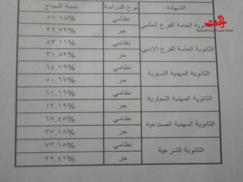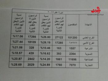 خاص الحدث - سوسن كمال الدين أطلق وزير التربية الدكتور هزوان الوز يوم أمس الأحد تاريخ 2/7/2017 خلال المؤتمر الصحفي الذي عقد في مقر وزارة التربية ، نتائج شهادة الدراسة الثانوية العامة بفرعيها الأدبي والعلمي والثانوية الشرعية والثانوية المهنية بفروعها ( النسوية والصناعية والتجارية ) لدورة 2017 م الأولى، والتي تم التوصل إلى إعدادها بكل دقة وموضوعية من خلال جهود متواصلة قام بها العاملون جميعا" في وزارة التربية وبخاصة في مديرية الامتحانات ومركز الحاسب لإعداد النتائج العامة وفي مديريات التربية حرصا" على مصلحة أبنائنا الطلبة ومستقبلهموفيما يأتي بعض الجوانب الكمية والنوعية لنتائج هذه الدورة : 1- الفرع العلمي :بلغ عدد المتقدمين في الفرع العلمي / 101200 /طالبا" وطالبة نجح منهم /56199 / طالبا" وطالبة ونسبة النجاح مقدارها /53'55%/ بينما بلغت نسبة النجاح في دورة 2016 م / 78'67%/2- الفرع الأدبي :بلغ عدد المتقدمين في الفرع الأدبي / 65977/طلاب نجح منهم / 29207/طالبا" وطالبة وبنسبة نجاح / 27'44 %/ بينما بلغت نسبة النجاح في دورة عام 2016م /74'50%/3- الشهادة الثانوية الشرعية:بلغ عدد المتقدمين للثانوية الشرعية /1557/طلاب نجح منهم / 1072/طالبا" وطالبة وبنسبة نجاح /85'68%/ بينما بلغت نسبة النجاح في دورة عام 2016م / 64'63%/4- الشهادة الثانوية المهنية النسوية :بلغ عدد المتقدمين للثانوية المهنية النسوية / 2364/ طالبا" وطالبة نجح منهم / 1524/ طالبا" وطالبة وبنسبة نجاح / 47'64%/ بينما بلغت نسبة النجاح في دورة عام 2016م / 37'69%/5- الشهادة الثانوية المهنية الصناعية: بلغ عدد المتقدمين للثانوية المهنية الصناعية /11696/طالبا" وطالبة نجح منهم /7606/ طالبا" وطالبة وبنسبة نجاح / 03'65%/بينما بلغت نسبة النجاح في دورة عام 2016م /08'55%/6 - الشهادة الثانوية المهنية التجارية:بلغ عدد المتقدمين للثانوية المهنية التجارية /7070/ طالبا" وطالبة نجح منهم / 3226/ طالبا" وطالبة وبنسبة نجاح /63'45%/ بينما بلغت نسبة النجاح في دورة عام 2016م /08'55%/ وقد أوضح السيد الوزير عدد المتقدمين لامتحانات شهادة الدراسة الثانوية بفروعها المختلفة وعدد كل من الراسبين الذين يحق لهم التقدم للدورة الثانية، وكذلك الذين لا يحق لهم التقدم للدورة الثانية ونسبتها المئوية وفق الجدول التالي:وبالتدقيق في نتائج هذه الدورة لوحظت المؤشرات النوعية الآتية : 1- الفرع العلمي : كان ترتيب الطلبة العشر الأوائل في القطر وفق الجدول الآتي : 2- الفرع الأدبي : كان ترتيب الطلبة الثلاث الأوائل في القطر وفق الجدول الآتي : 3- بالنسبة للشهادة الثانوية الشرعية والثانوية المهنية النسوية والثانوية المهنية الصناعية والثانوية المهنية التجارية فقد كانت نتائج المتفوقين على الشكل التالي : وأوضح الدكتور هزوان وزير التربية أن النتائج تم إصدارها بواسطة شبكة التربية للمعلومات لجميع المحافظات ولبعض المدارس التي ترتبط مع الشبكة مباشرة ( انترنت ) موزعة في مناطق المحافظات وفي الوقت نفسه تم نشر هذه النتائج مفصلة على موقع الوزارة : www.moed.gov.sy وبالنسبة لأعداد المتقدمين والناجحين حسب نوع الدراسة دورة 2017 م فقد كانت على الشكل التالي : ومقارنة بأعداد المتقدمين والناجحين حسب نوع الدراسة دورة 2016م فقد كانت على النحو التالي:بالنسبة لمادة الرياضيات فقد أوضح الوزير اللغط الذي حدث في هذه المادة وما نشر حول هذا الموضوع على صفحات التواصل الإجتماعي وما تفسيره لذلك أجاب السيد الوزير بأن نسبة النجاح في مادة الرياضيات هي 98'70% وأن وزارة التربية مركز القياس والتقويم التربوي أجرت دراسة تحليلية تقويمية لمادة الرياضيات لامتحان الشهادة الثانوية وخلص إلى النتائج التالية : 1- كانت الأسئلة ممثلة لمحتوى كتب مادة الرياضيات2- توزعت الدرجات بشكل عادل على الأسئلة وفق الأهمية النسبية لكل سؤال3- ادرجت الأسئلة في مستوى صعوبتها4- سلم التصحيح جاء مرنا" مراعيا" للمعرفة الكلية و الجزئية للطالب ومشجعا" على التفكير5- جاءت الأسئلة واضحة وتبين للطالب المطلوب منه وتراعي مستوى تفكيره 6- اتسمت الأسئلة بملاءمتها 