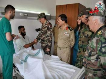 بتوجيه من السيد الرئيس الفريق بشار الأسد القائد العام للجيش والقوات المسلحة وبمناسبة حلول عيد الأضحى المبارك قام السيد العماد فهد جاسم الفريج نائب القائد العام للجيش والقوات المسلحة ـ نائب رئيس مجلس الوزراء ـ وزير الدفاع يرافقه عدد من ضباط القيادة العامة بزيارة ميدانية لأحد تشكيلاتنا المقاتلة بريف درعا، والتقى المقاتلين في مواقعهم وهنأهم بالعيد ونقل إليهم محبة السيد الرئيس الفريق بشار الأسد واعتزازه ببطولاتهم وتضحياتهم وتقديره للجهود الكبيرة التي يبذلونها في الذود عن الوطن وصون عزته وكرامته.واطلع السيد العماد من القادة الميدانيين على طبيعة المهام المسندة ومستوى جاهزية الوحدات وحالتها المعنوية، وأثنى على الجهود المبذولة في الحفاظ على أعلى درجات اليقظة والحذر، مؤكداً أن الانتصارات التي يحققها الجيش العربي السوري بالتعاون مع الحلفاء والأصدقاء على كامل مساحة الوطن ما كانت لتتحقق لولا الإرادة الصلبة للمقاتلين وعزيمتهم الصامدة وإصرارهم على تحقيق النصر مهما بلغت التحديات وغلت التضحيات.بدورهم أكد المقاتلون أنهم سيبقون الجند الأوفياء والأبناء البررة الذين يرخصون الدماء والأرواح في سبيل إعادة الأمن والاستقرار إلى كل شبر من أرض الوطن.كما زار السيد العماد جرحى الجيش والقوات المسلحة في مشفى تشرين العسكري، ونقل إليهم محبة السيد الرئيس الفريق بشار الأسد واعتزازه بتضحياتهم وشجاعتهم وهنأهم بالعيد وتمنى لهم ولذويهم دوام الصحة والعافية، واطمأن من الكادر الطبي على أوضاعهم الصحية والخدمات التي تقدم لهم، وأثنى على جهود العاملين في المشفى ومستوى الرعاية والاهتمام بالجرحى متمنياً لهم التوفيق والنجاح في عملهم. وبهذه المناسبة قام قادة المناطق العسكرية بزيارة مثاوي الشهداء ووضعوا أكاليلاً من الزهر باسم السيد الرئيس الفريق بشار الأسد القائد العام للجيش والقوات المسلحة على النصب التذكارية وقرؤوا الفاتحة على أرواح الشهداء الطاهرة وأدوا التحية الرسمية، بعد ذلك زار قادة المناطق الجرحى في المشافي العسكرية وهنؤوهم بالعيد وتمنوا لهم الشفاء العاجل ولذويهم الصحة والعافية، مؤكدين لهم أن تضحياتهم وبطولاتهم ستبقى أنموذجاً يحتذى في البذل والعطاء ونبراساً يهتدى به في الدفاع عن الوطن.
