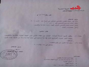 أصدر وزير الإعلام المهندس محمد رامز ترجمان القرار رقم 563/و تاريخ. 14 / 9 / 2017. والذي حصلت سورية الحدث على نسخه منه وتضمن تكليف الزميل أسامة شحادة من الفئة الأولى بمهام مدير صوت البرنامج العام " إذاعة دمشق . خلفاَ للسيد عماد الدين ابراهيم .أسرة سورية الحدث تبارك للزميل أسامة الشحادة مهامه الجديد وتتمنى له التوفيق والنجاح