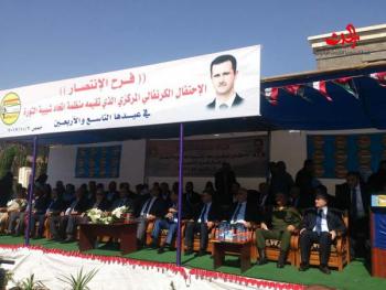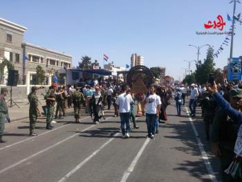 أقامت منظمة اتحاد شبيبة الثورة اليوم كرنفالا مركزيا بعنوان فرح الانتصار في حمص بمناسبة العيد الـ 49 لتأسيسها وذلك أمام ثانوية عبد الحميد الزهراوي وذلك بمشاركة الوفود الشبيبية من كافة المحافظات السورية , وبدأت عروض الكرنفال من أمام مبنى مديرية التربية بحمص باتجاه مدرسة عبد الحميد الزهراوي حيث شارك فيها الآلاف من الشبيبيين من جميع روابط المدينة والريف ومن روابط المحافظات كافة حيث حملوا الأعلام واللافتات الوطنية وصور السيد الرئيس بشار الأسد ونادوا بالشعارات الشبيبية والوحدة الوطنية - وأكد الأمين القطري المساعد لحزب البعث العربي الاشتراكي المهندس هلال الهلال أن الحرب التي تتعرض لها سورية كان هدفها تدمير الطاقات الشابة وتهجير العقول المبدعة ولكن وعي شبابنا أفشل مؤامراتهم- كما أكد رئيس منظمة اتحاد شبيبة الثورة معن عبود أن المنظمة رسخت كل إمكانياتها في رعاية الشباب باعتبارهم الرافعة الأساسية في المجتمع ولهذا السبب عملت على رعاية الجيل وتثقيفه لأنه عمادة الوطن .- ونوه محافظ حمص طلال البرازي بأهمية إقامة الكرنفال في حمص وتزامنه مع أعياد تشرين ورسائل الانتصار التي يحملها من المدينة اليوم وهي تعيش فرحة انتصارات الجيش العربي السوري في جميع المحافظات .- حضر الكرنفال عضوا القيادة القطرية لحزب البعث الدكتور عمار ساعاتي رئيس مكتب الشباب وعمار السباعي رئيس المكتب الاقتصادي والدكتور هزوان الوز وزير التربية وأمين فرع حمص لحزب البعث العربي الاشتراكي مصلح الصالح وقائد الشرطة ورئيس جامعة البعث ورؤساء المنظمات الشعبية والنقابات المهنية بحمص وعدد من أعضاء قيادة منظمة اتحاد شبيبة الثورة وأعضاء مجلس الشعب ورجال الدين وحشد كبير من المواطنين مكتب حمص والمنطقة الوسطى أندريه ديب – ماريا حسن