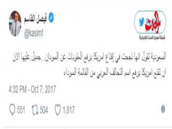 سخر الإعلامي والمذيع بقناة "الجزيرة"، فيصل القاسم، من السعودية، وذلك على إثر إعلانها بنجاح جهودها في رفع العقوبات الاقتصادية الأمريكية عن السودان، داعيا إياها بإقناع الولايات المتحدة من رفع اسمها من القائمة السوداء لقتلها الاطفال والتي اعلنتها الأمم المتحدة قبل يومين.وقال القاسم في تدوينة له عبر حسابه بموقع تويتر:” السعودية تقول انها نجحت في إقناع امريكا برفع العقوبات عن السودان…جميل.عليها الان ان تقنع امريكا برفع اسم التحالف العربي من القائمة السوداء".وكانت السعودية قد أعلنت بأن جهودها المبذولة قد أسفرت عن رفع العقوبات الأمريكية عن السودان، مقدمة التهنئة للرئيس السوداني عمر البشير والشعب السوداني على هذا الأمر.جاء ذلك بعد يوم واحد من إدراج الأمم المتحدة، لمايسمى بالتحالف العربي الذي ترأسه السعودية في القائمة السوداء بسبب قتل وتشويه أطفال في اليمن.ووفقا لما ورد في أسباب ضم التحالف للقائمة السوداء، فقد أدت أفعال التحالف بشكل موضوعي إلى الإدراج بسبب قتل وتشويه أطفال حيث نسبت 683 حالة إصابة لأطفال لهذا الطرف.. ونتيجة لمسؤوليته عن 38 حادثة جرى التحقق منها عن هجمات على مدارس ومستشفيات خلال 2016″.