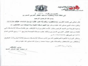 تقيم وزارة الأوقاف السورية بدعوة من الرئيس بشار الاسد، صلاة الاستسقاء في كل المساجد عقب صلاة الجمعة بتاريخ 11 ربيع الآخر لعام 1439 الموافق 29-12-2017.وذكرت الوزارة في بيان لها إلى أئمة وخطباء المساجد تلقت سورية الحدث نسخه منه “المواطنين بآداب صلاة الاستسقاء وهي صيام ثلاثة أيام وأداء الحقوق والإكثار من الاستغفار والصلاة على الرسول الكريم محمد صلى الله عليه وسلم”.وتشهد بعض المناطق في سوريا حالة من الانحباس المطري وتغير المناخ لمثل هذه الفترة من السنة ما يؤثر سلبا على الكثير من المحاصيل الزراعية وتأمين مياه الشرب في السدود التي تخزن خلال فترة فصل الشتاء.