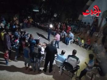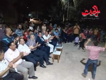 متابعة..هيثم عليحفل فني غنائي متنوع أقامه المركز الثقافي العربي في بلدة جباب في مركز الايواء الخاص بالمهجرين من المناطق التي تسيطر عليها العصابات الارهابية في منتجع جباب واقيم تحت عنوان بواسلنا يحررون الديار ونحن نرسم البسمةحيث قدم الشاعر والفنان محمد محي الدين السلامة لوحات فنية وطنية رائعة وأغان من فلوكلور حوران والتي تغنت بحب الوطن وجيش الوطن وقائد الوطن الدكتور بشار الأسدحضر الحفل الرفيق خالد قناة والرفيقة زودة محارب أعضاء قيادة فرع درعا لحزب البعث العربي الاشتراكي، والرفيق فواز الشرع عضو مجلس الشعب وعضو المكتب التنفيذي في المحافظة محمد خير القاعد ومدير السياحة بدرعا ياسر السعدي ومعاون مدير التربية بدرعا أحمد الحناوي . والزملاء الاعلاميين محمود ومعن الجمعات ورئيس مجلس بلدة جباب وأمناء الفرق الحزبية. .