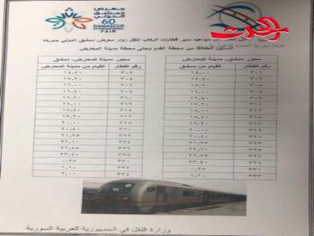 أعلنت وزارة النقل مواعيد سير قطارات الركاب المخصصة لنقل زوار معرض دمشق الدولي انطلاقا من محطة القدم وحتى محطة مدينة المعارض الجديدة على طريق مطار دمشق الدولي وبالعكس.ووفق جدول المواعيد فإن أول رحلة ذهاب ستنطلق يوميا عند الساعة الثانية ظهرا من محطة القدم باتجاه مدينة المعارض وذلك بدءا من يوم الجمعة ليكون عدد رحلات الذهاب خلال اليوم الواحد 17 رحلة ومثلها للإياب بمعدل رحلة كل أربعين دقيقة على أن تكون آخر رحلات الذهاب عند الساعة الواحدة وعشر دقائق فجرا.وتبدأ رحلات الإياب عند الساعة الثانية وأربعين دقيقة ظهرا من مدينة المعارض باتجاه محطة القدم لتكون آخر رحلات الإياب عند الساعة الثانية فجرا.وتنطلق فعاليات الدورة الـ 60 من معرض دمشق الدولي في الـ 6 من أيلول الجاري وتستمر حتى ال 15 منه ويستقبل المعرض زواره في السابع من أيلول القادم فيما سيكون السادس منه للافتتاح الرسمي.