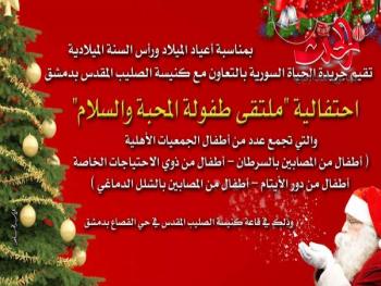 دمشق - فراس قصقص بالتزامن مع أعياد الميلاد المجيد ورأس السنة الميلادية أقامت جريدة الحياة السورية بالتعاون مع كنيسة الصليب المقدس ومشاركة عدة شركات تجارية وجمعيات أهلية احتفالية ملتقى ” طفولة المحبة و السلام” في كنيسة الصليب المقدس في دمشق.جمعت الاحتفالية عدد من أطفال الجمعيات الأهلية ( أطفال من المصابين بالسرطان – أطفال من ذوي الاحتياجات الخاصة – أطفال من دور الأيتام – أطفال من المصابين بالشلل الدماغي )وتركزت على منهج الفكر والتعلم والموهبة والاندماج والتسلية التي من شأنها أن تبعث رسائل ثقافية وطنية إنسانية للعالم أجمع ضمن فترة الأعياد المجيدة لتبث معاني الفرح والثقة والتعاون والفائدة وبحضور عدد من الشخصيات الروحية والرسمية والاجتماعية والفنية.وتضمنت الاحتفالية فقرات (غناء – عرض موسيقي ومسرحي - شعر - رسم - أعمال يدوية - ألعاب خفة– رقص - رسم على الوجوه والأيدي - تزيين شجرة الميلاد - كتابة أمنيات الأطفال)“رنا زيتون” مدير الملتقى تحدثت عن أهمية الملتقى قائلة:” نحن اليوم و بمناسبة أعياد الميلاد و رأس السنة و مع عودة الأمان لدمشق و لسورية بفضل انتصارات الجيش العربي السوري،أحببنا من خلال هذا الملتقى و بمشاركة بعض الجمعيات الأهلية بأن نشارك أطفالهم فرحة العيد، وأيضاً لكي يكون هناك نوع من الاندماج بين الأطفال سواء كانوا أطفال مصابين ببعض الأمراض أو أطفال سليمين،و هذا الملتقى قام على هذه الفكرة وهي تقديم نوع من الفرح لهؤلاء الأطفال و خلق نوع من التشاركية بينهم جميعاً”.الأستاذ “حسان دياب” مشرف تسويق ”مجموعة كبور الدولية” راعي الاحتفالية عبر عن سعادته قائلا: بما اننا اليوم في مرحلة إعادة الإعمار فقد كانت لدينا القناعة بأن الإعمار يبدأ من الإنسان أولا وبما أن الطفولة هي منطلق الإنسانية فقد أولينا أطفالنا في المجتمع أكبر اهتمامنا وبكل الحب كنا معهم في الكثير من الفعاليات بهدف بث معاني الفرح وزرع الثقة وكلنا أمل بغد أفضل نبنيه سوياً لأبنائنا ... ولذلك فقد دأبت مجموعة كبور بكوادرها كافة وبتوجيه من إدارتها للمساهمة بهذا الهدف السامي ... فلن تألو جهداً بالتواجد في جميع المناسبات التي تحمل الطابع الإنساني والتي من شأنها الارتقاء بالفرد أولاً ... فتواجدنا بالعديد من المناسبات كرعاة أو مبادرين أو مساهمين وكان هدفنا الأكبر هو وضع بصمة في جميع الفعاليات التي تحمل الطابع التربوي والتنموي والإنساني ليكون لنا شرف المساهمة في مسيرة البناء في ظل القيادة الحكيمة للدكتور بشار الأسد ... كما حاولنا دائما دعم الاقتصاد الوطني في وجه الحرب الاقتصادية الشرسة على وطننا الحبيب سورية وحافظنا دائماً على تواجد أصنافنا الغذائية في السوق والحفاظ على انسياب المواد بشكل طبيعي في السوق والحفاظ على الجودة المعهودة والسعر المنافس والمتناسب والمدروس ... وأخيرا أتوجه بالشكر لمنظمي هذه الفعالية الكريمة ونرجو أن تكون احتفالات أعياد الميلاد ورأس السنة لهذا العام انطلاقة لفرح جديد وبداية ازدهار لبلدنا الحبيب ... وأردف السيد دياب موجهاً تحية حب وتقدير إلى قواتنا المسلحة في الجيش العربي السوري والقوى الرديفة مع التمنيات بالشفاء العاجل للجرحى والرحمة لأرواح شهدائنا الإبرار الذين لولا تضحياتهم لما أتيحت لنا الفرصة اليوم للتواجد في هذه القاعة محتفلين بعيد الميلاد المجيد ... كما أتقدم بالشكر لأصحاب الأيادي البيضاء ومؤسسات المجتمع المدني التي كان لها الدور الكبير في تخطي الأزمة على الصعيد الإنساني ...وعن مشاركة شركة "مكَي" للصناعات الغذائية كأحد الرعاة لهذه الاحتفالية تحدثت الآنسة سهام طباع مدير التسويق قائلة : "ضمن عالم الطفولة الذي قد لا يجيد الكثيرين التعامل معه، حيث يشكل الأطفال أساس المجتمع السليم والقوي ولأنهم بحاجة لعناية مجتمعية وإنسانية بشكل خاص وحمايتهم ودعمهم شاركنا برعاية هذه الاحتفالية التي أقيمت خصيصا لتقديم الدعم النفسي والاجتماعي لأكثر من مائتان وخمسون طفل وطفلة من عدد 