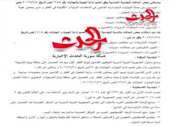 أصدرت مؤسسة الطيران العربية السورية تعليمات ناظمة لدخول الرعايا العرب والأجانب إلى سورية.وبموجب تعميم موجه للمدراء الأقليميين والممثلين الخارجيين والوكلاء في المحطات الخارجية، طلبت المؤسسة التقيد بالسماح لرعايا الدول العربية والأجنبية بالدخول إلى القطر من المراكز الحدودية بعد الحصول على سمة الدخول من بعثتنا الدبلوماسية أو القنصلية في الخارج تخول حاملها الدخول إلى القطر أو المرور بها، ويجوز منح السمات لرعايا الدول الأجنبية التي لبس لسورية تمثيل دبلوماسي فيها من المراكز الحدودية مباشرة بعد استيفاء الرسوم وفقا لمبدأ التعامل بالمثل.كما يجوز منح السمات لرعايا الدول العربية من المركز الحدودية مباشرة بعد استفاء الرسم وفقا لمبدأ التعامل بالمثل، ولمدير إدارة الهجرة والجوازات السماح بدخول رعايا الدول العربية أو الأجنبية من أي جنسية كانت بعد التدقيق أصولا، وتطبق الاتفاقيات القنصلية الثنائية، فيما يتعلق بدخول رعايا تلك الدول وخروجهم ومرورهم ولإقامتهم. ويستثنى من ذلك بعض الجنسيات العربية التي تخضع لأحكام خاصة وتعليمات ناظمة شملت الجنسية التونسية والليبية والعراقية والفلسطينية، وتعليمات خاصة بالصحفيين والفنانات، الخ.وبين مدير مديرية الشؤون التجارية والتسويق محمد رضا عدي أن التعليمات الناظمة تأتي تزامنا مع توقع دخول شركات طيران جديدة من الممكن أن تحمل رعاياها، مشيرا إلى أن التعليمات تنظم عملية قبول الرعايا من الجنسيات المختلفة.ولفت عدي إلى ضرورة وضع تعليمات واضحة على صعيد تذاكر السفر والموافقات اللازمة لدخول الرعايا وخروجها، ومعرفة كيفية التعامل معها، ولاسيما أن ظروف الأزمة فرضت متغيرات كثيرة، علما أن التعليمات تنظم حركة الدخول عبر المنافذ الحدودية البرية.