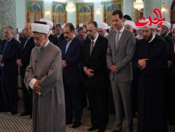 أدى السيد الرئيس بشار الأسد صباح اليوم صلاة عيد الفطر السعيد في رحاب جامع السيد الرئيس حافظ الأسد بدمشق.وأدى الصلاة مع الرئيس الأسد وزير الأوقاف والمفتي العام للجمهورية وعدد من المسؤولين في الدولة والحزب وعدد من أعضاء مجلس الشعب ومجموعة من علماء الدين الإسلامي وجمهور من المواطنين مؤتمين بفضيلة الشيخ بشير عيد الباري مفتي دمشق.وألقى الشيخ الباري خطبة العيد أكد فيها المعاني العظيمة والسامية لعيد الفطر المبارك، مشيراً إلى أن الله تعالى بارك بلادنا بلاد الشام التي بقيت متألقة عبر التاريخ على الرغم من الأحداث والظروف التي مرت عليها وهذه البركة هي التي جعلت سورية اليوم صامدة شامخة بوجه الحرب الإرهابية عليها.ولفت الشيخ الباري إلى أن أمتنا المجاهدة الصامدة تعيش على أرض هذا الوطن الحبيب الذي تكلؤه عناية الله.. هذه الأرض هي شامنا التي باركها الله تحيا جسداً واحداً وروحاً واحدة وكلمة واحدة.وأشار الشيخ الباري إلى أن أبناء سورية وجيشها الباسل يكتبون اليوم بقيادة الرئيس الأسد تاريخاً مجيداً وهم يتمسكون بأرضهم ويدافعون عن دينهم وحضارتهم ضد الإرهاب وضد ما أراده أعداء الإسلام من تشويه لصورة الإسلام الصحيح.وأكد خطيب العيد أن الرئيس الأسد يصون الثوابت ويؤمن بالإسلام كما أنزله الله نقياً طاهراً من تحريف أعدائه المبطلين وهو يدافع عن أمتنا العربية والإسلامية وعن العروبة لأنه واضح الرؤية مؤمن بربه متمسك بقيمه الأصيلة وهو ما تم تجسيده في كلمته في افتتاح مركز الشام الإسلامي الدولي لمواجهة الإرهاب والتطرف والتي أكد فيها أن التدين بناء والتطرف هدم وأن مكافحة الإرهاب تبدأ بالتدين الصحيح الذي يشكل الجسر من أجل الوصول إلى الاعتدال والتطبيق الصحيح للدين وحمايته من الانحراف.ولهج مفتي دمشق بالدعاء إلى الله تعالى أن يحفظ سورية وجيشها العربي السوري الباسل حامي الديار وأن يرحم شهداءها ويشفي جرحاها وأن نرى النصر العزيز المؤزر على الصهيونية المحتلة الباغية باسترجاع قدسنا الشريف وجولاننا الحبيب وأن ينصر الرئيس الأسد ويسدد خطاه وأن يؤيده ويحفظه ويوفقه لما فيه خير الوطن ومصلحته.