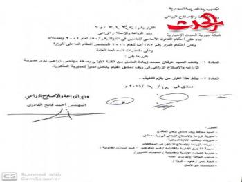 سورية الحدث _ خاص ..أصدر وزير الزراعة المهندس أحمد القادري اليوم قراراً كلف بموجبه المهندس عرفان محمد زيادة بمهام مدير الزراعة والإصلاح الزراعي في ريف دمشق ، يشار إلى أن زيادة كان يشغل منصب معاون مدير الزراعة في ريف دمشق .اسرة سورية الحدث تبارك للمهندس عرفان المنصب الجديد ونتمنى له النجاح والتوفيق ونتمنى للدكتور علي سعادات مدير الزراعة السابق التوفيق والنجاح في أعماله المستقبلية ونشكره لماقدمه من خير للقطاع الزراعي في سورية|