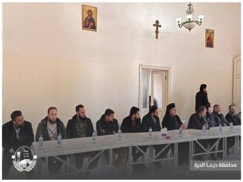 اجتمعت إدارة العمليات العسكرية والشؤون السياسية مع ممثلي الطائفة المسيحية في بلدة خبب في الريف الشمالي لمحافظة درعا.