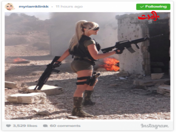 نشرت عارضة الأزياء اللبنانية ميريام كلينك صورة لها عبر حسابها الرسمي على انستغرام وهي تحمل الأسلحة كالبندقية وجعبة القنابل. وقد علّقت كلينك على الصورة بالقول: "لن أتوقّف عن محاربة كلّ الأوغاد الذين أصادفهم في حياتي".شاهدوا الصورة وشاركونا آراءكم: