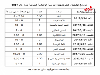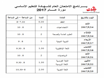 أصدرت وزارة التربية اليوم برنامجي امتحان شهادتي التعليم الأساسي والإعدادية الشرعية لعام 2017.وبينت الوزارة أن الامتحانات تبدأ في الـ 14 من أيار القادم وتنتهي في الـ 25 منه لشهادة التعليم الأساسي والـ 28 منه لشهادة الدراسة الإعدادية الشرعية.وتبدأ امتحانات شهادة التعليم الأساسي بمادة الاجتماعيات يوم الأحد الموافق لـ 14-05-2017 تليها مادة العلوم والصحة يوم الثلاثاء 16-5 والتربية الدينية 17-5 واللغة الانكليزية 18-5 والرياضيات 21-5 واللغتان الفرنسية والروسية يوم الاثنين 22-5 واللغة العربية 25-5.كما تبدأ أيضا امتحانات شهادة الدراسة الإعدادية الشرعية بمادة الاجتماعيات يوم الأحد الموافق لـ 14-05-2017 تليها مادة العلوم العامة والصحة 16-5 والتفسير التحليلي 17-5 واللغة الانكليزية 18-5 والرياضيات 21-5 واللغة الفرنسية 22-5 والحديث النبوي 23-5 واللغة العربية 25-5 والفقه الشافعي والحنفي 27-5 والعقيدة الإسلامية 28-5 فيما تبدأ الامتحانات الشفهية الاثنين 29-5.وكانت الوزارة أصدرت في الثامن والعشرين من الشهر الماضي تعليمات التسجيل لامتحانات الشهادات العامة دورة 2017 بهدف إنجاز العملية الامتحانية بمواعيدها حيث يبدأ التسجيل لامتحانات الدورة الأولى للشهادات العامة اعتباراً من يوم الأحد 11-12-2016 للطلاب النظاميين وطلاب الدراسة الحرة.