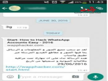 اليوم يصل إلى الواتسأب طرق جديدة للأختراق تعرف عليها كي لا تقع في هذه الخدعة ولا في غيرها ظهرت هذه الطريقة بفكرة مختلفة نوعا ما، لكن الهدف واحد، فهي على شكل تحذير أو نتبيه من شخص قريب أو غريب لا يهم، مضمون الرسالة قائم على أن حسابك ثم إختراقه و سحب منه جميع الصور و الفيديوهات، كما أن جهازك هو تحت المراقبة، هنا و بطريقة أوتوماتيكية ستطرح سؤال على نفسك دون التاكد من صحة المعلومة "ما الحل ؟" لكن الهاكر، فكر في ذلك قبلك و وضع لك رابط لزيارته حتى تتمكن من إستعادة بياناتك. بمجرد دخولك هذا الموقع سيطلب منك إدخال بيانات الحساب من رقم الهاتف و الدولة.. حتى تتمكن من استعادة ملفاتك وبعد التسجيل سوف يقوم بتحميل ملف على جهازك والتجسس عليك ونشر جميع الروابط مع الأصدقاءلا تصدقوا أي شي يرسل لكم على الواتسأب ولا تصدقوا أي شي بينتشر على الفيسبوك الا اذا كان المصدر معروف يعني شركة الفيسبوك مثلا او الواتسأب ومع هيك لازم ماتفتحوا هيك روابط ابل ماتسألوا أصحاب الخبرة لأنو ممكن الهاكرز يبتكروا طرق جديدة ولسا ما حدا بيعرفها