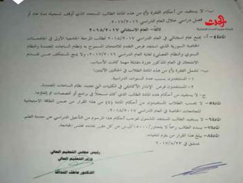 أصدر وزير التعليم العالي عاطف نداف قرارا حصلت سورية الحدث على نسخة منه، يقضي بمنح الطالب النظامي المستجد والراسب في المرحلة الجامعية الاولى في الجامعات الخاصة (نظام الساعات المعتمدة والنظام السنوي والنظام الفصلي) وكذلك الطالب الذي استنفد فرص الرسوب قي الفصل الاول او الثاني او الفصل الصيفي من العام 2016/2017 ، دورة امتحانية اضافية في نهاية العام 2016/2017 في جميع المقررات التي حقق شروط التقدم لامتحاناتها.ويعد الطالب منقولا إلى السنة الأعلى إذا كان يحمل 5 مقررات على الأكثر سواء كانت إدارية أو غير إدارية في الكليات التي تعتمد النظام الفصلي أو السنوي في العام الدراسي 2016/2017 فقط.كما نص القرار على منح الطالب عام استثنائي في العام الدراسي 2017/2018 على أن يشمل المستنفدون بسبب هذه السنوات الدراسية والمستنفدون فرص الإنذار الأكاديمي في الكليات التي تعتمد نظام الساعات المعتمدة مع تسديد رسم لايتجاوز 15 ألف عن كل مقرر يحدده مجلس الجامعة.الوطن