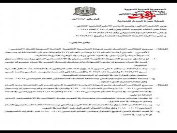 سمح المجلس الأعلى للتعليم التقاني للطالب الحاصل على شهادة الدراسة الثانوية والذي التحق بخدمة العلم الإلزامية أو الاحتياطية أن يسجل في الاختصاص الذي يرغب فيه.واشترط المجلس أن يكون الطالب قد حصل على الشهادة الثانوية خلال الفترة من 2011 وحتى 2016 ولم يسجل في المعاهد الخاضعة لإشراف المجلس الأعلى للتعليم التقاني.كما سمح المجلس للطالب الحاصل على شهادة الدراسة الثانوية العامة السورية فقط العلمي والأدبي والمهني أن يسجل في المعهد الذي يرغب وفق شروط محددة.وحدد المجلس الطلاب الذين لم يتقدموا إلى المفاضلة أو يسجلوا تسجيلا مباشرا منذ عام 2011 حتى عام 2016 .وايضاً سمح المجلس للطالب الحاصل على شهادة الدراسة الثانوية الذي تقدم إلى المفاضلة منذ العام الدراسي 2010-2011 وحتى العام 2016-2017 أن يسجل في المعاهد.وذكر المجلس أنه بإمكان الطالب التسجيل في المعهد في بداية العام الدراسي 2017-2018 ولغاية 1-10-2017 ولو كان الطالب قد قبل في المعهد لكنّه لم يسجل وقتها.