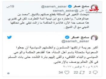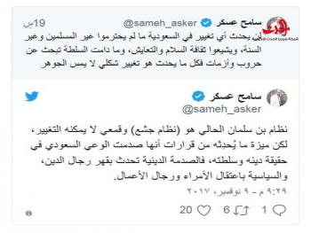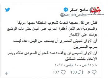 شنَّ الكاتب والمحلل السياسي المصري سامح عسكر هجوما عنيفا على السعودية وولي عهدها محمد بن سلمان.واكد سامح عسكر أن المملكة سبب كل مصيبة تحدث لشعوب المنطقة، داعيا الرئيس عبد الفتاح السيسي بأن يوقف دعمه للعدوان على اليمن.وقال عسكر” في تدوينات له عبر حسابه بموقع التدوين المصغر “تويتر” :” فتش عن كل مصيبة تحدث لشعوب المنطقة سببها أمريكا والسعودية، هم الذين أعلنوا الحرب على اليمن حتى بات الوضع يوشك على الانفجار آن الأوان للجيش المصري أن ينسحب من اليمن، هذه ليست حرب المصريين آن الأوان للسيسي أن يوقف دعمه للعدوان السعودي هناك ويأمر الإعلام بكشف الحقائق”.واوضح في تغريدة أخرى بأن ” أكبر جريمة ارتكبها المسلمون وأنظمتهم السياسية أن جعلوا السعودية متحدثة باسم أهل السنة، هذا أفقدهم الحكمة والوعي السياسي والبناء الثقافي، وألقى إليهم بذرة التشدد حتى بات المسلم في كل العالم يوصف بالإرهابي”.وأضاف عسكر بأن ”نظام بن سلمان الحالي هو (نظام جشع) وقمعي لا يمكنه التغيير، لكن ميزة ما يُحدِثه من قرارات أنها صدمت الوعي السعودي في حقيقة دينه وسلطته، فالصدمة الدينية تحدث بقهر رجال الدين، والسياسية باعتقال الأمراء ورجال الأعمال”.