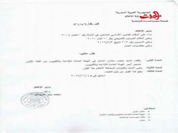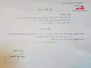 خاص - سورية الحدث ماذا يحصل في وزارة الاعلام أصدر وزير الإعلام المهندس رامز ترجمان قرارا حمل الرقم 678 حصلت سورية الحدث على نسخه منه تضمن :ينهي العمل بالقرار 214/و تاريخ 24/7/2016 المتضمن تكليف عماد سارة بتسيير امور الهيئة العامة للاذاعة والتلفزيون .كما وأصدر الوزير ترحمان القرار رقم 679/و والذ نص على تكلف السيد حبيب سلمان العامل بالهيئة العامة للاذاعة والتلفزيون من الفئة الأولى بتسيير أمور الهيئة .وفي سابقة أولى من نوعها بعد صدور قرار إنهاء تكليف عماد سارة وتعيين حبيب سلمان وبعد ساعة على القرارين 678- 679 يصدر وزير الاعلام قرار حمل الرقم 680 حصلت سورية الحدث على نسخه من القرارالذي ينص على طي القرار 678 بإعفاء عماد سارة من منصبة .يذكر أن حبيب سلمان كان مديراً للمركز الإخباري في التلفزيون السوري، قبل تعيينه معاوناً لمدير الهئية العامة للإذاعة والتلفزيون.عماد سارة يشغل موقع مدير الهيئة العامة للإذاعة و التلفزيون منذ ال 2016شغل منصب مدير عام الإخبارية السورية منذ 2011 و حتى 2016 و كان قبل ذلك مديرا للأخبار في “قناة الدنيا” السورية.ر