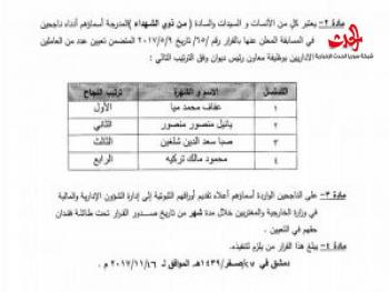 أصدرت وزارة الخارجية والمغتربين اليوم أسماء الناجحين في المسابقة التي أعلنت عنها في أيار الماضي لتعيين عاملين في الوزارة بوظيفة معاون رئيس ديوان.وبينت الوزارة في بيان لها تلقت سانا نسخة منه اليوم أنه يمكن للناجحين تقديم اوراقهم الثبوتية إلى إدارة الشؤون الإدارية والمالية بالوزارة خلال مدة شهر من تاريخه تحت طائلة فقدان حقهم في التعيين مشيرة إلى أنه يمكن للراغبين الاطلاع على أسماء الناجحين بالمسابقة من خلال الموقع الالكتروني لوزارة الخارجية والمغتربين وكانت الوزارة أجرت المقابلات الشفهية للناجحين في المسابقة الكتابية يومي الجمعة والسبت الموافقين لـ13و14 من تشرين الاول الماضي بعد أن أصدرت في أيلول الماضي أسماء الناجحين بالامتحان الكتابي.وكانت وزارة الخارجية والمغتربين اعلنت في أيار الماضي عن إجراء مسابقة لتعيين عدد من العاملين الإداريين في الوزارة لوظيفة معاون رئيس ديوان من الفئة الأولى وفق الشواغر المحددة في الملاك لحملة الإجازة الجامعية في الاقتصاد والحقوق والإعلام والآداب والعلوم الإنسانية أقسام اللغة الإنكليزية والفرنسية والتاريخ والجغرافيا وعلم الاجتماع أو ما يعادلها.