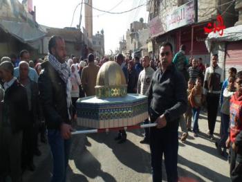سورية الحدث _ راما قضباشي خرجت مسيرة حاشدة بعد صلاة يوم الجمعة 15/12/2017م في مخيم خان دنون رفضا للقرار الأمريكي الذي اعترف بالقدس عاصمة للكيان الصهيوني ودعما لانتفاضة الشعب الفلسطيني في وجه المحتل الغاشم، بمشاركة قادة وممثلي الفصائل الفلسطينية.أكد خالد عبد المجيد أمين سر تحالف قوى المقاومة الفلسطينية في كلمة له أن الشعب الفلسطيني في الداخل وفي الشتات والمهاجر توحد وراء القدس والانتفاضة الثالثة، ولن يسمح ل "ترامب" وللعدو الصهيوني أن يدنس القدس، فإرادة الشعب الفلسطيني قوية ولن تهزم.وأشار عبد المجيد أن بعض العرب خططوا لصفقة القرن في الرياض لتصفية القضية الفلسطينية، ولكن هذا القرار أجج المشاعر وجدد الانتفاضة والمقاومة ووقف سدا منيعا أمام صفقاتهم. ودعا لمراجعة حقيقية للقيادات الفلسطينية فبعد "25" عام على اتفاق أوسلو ليس من المقبول الاستمرار في عملية السلام و التنسيق الأمني مع العدو. وتابع قائلا: "إن المخيمات الفلسطينية قدمت شهداء إلى جانب الجيش العربي السوري، وتعمدت دماؤنا في فلسطين ولبنان وسورية وفي كل بقعة من أرضنا العربية، ودمشق تؤكد على الموقف المترابط من خلال الانتصارات التي حققها محور المقاومة في هزيمة أكبر مشروع أمريكي صهيوني هدفه تصفية القضية الفلسطينية وحقوق شعبنا، وخيارنا هو المقاومة والانتفاضة حتى تحرير كامل فلسطين." ومن جانبه أكد مختار مخيم خان دنون نضال حسين جود أن هذا المخيم الذي صمد في وجه العصابات الإرهابية التكفيرية وقدم ما يزيد عن خمس وسبعون شهيدا دفاعا عن سورية ووفاء لما قدمته دعما للشعب الفلسطيني وقضيته، لن يبخل في تقديم التضحيات لاستعادة فلسطين كاملة وعاصمتها القدس الشريف، مشيرا إلى النفاق العربي الذي حدث في اجتماعات الجامعة العربية ومنظمة المؤتمر الإسلامي، معتبرا أن فالقدس هي هوية وكرامة كل فلسطيني وعربي، مشددا على الاستمرار في نهج المقاومة وإسقاط كل اتفاقيات الذل مع العدو الصهيوني.