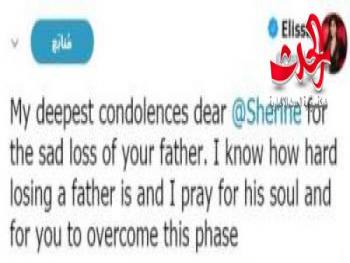 نعت الفنانة اللبنانية إليسا والد الفنانة المصرية شيرين عبد الوهاب الذي توفي اليوم، حيث نشرت عبر حسابها الخاص على احد مواقع التواصل الإجتماعي منشوراً جاء فيه:" تعزيتي الحارة لشيرين بتعزية والدها للخسارة المحزنة لوالداهااعرف جيددا معنى خسارة الاب واصلي له ولك لتجتازي هذه المحنة".يذكر ان جثمان والد شيرين عبد الوهاب سيشيع اليوم بعد صلاة العصر من مسجد الحصري بالسادس من أكتوب في مصر.شيرين عبد الوهاب كانت قد احتفلت مؤخراً بزفافها على الفنان المصري حسام حبيب داخل إحدى الفيلات على طريق الإسكندرية الصحراوي، في جو عائلي وبحضور اصدقاء مقربين للعروسين، كما أن شيرين أحيت منذ أيام قليلة أولى حفلاتها بعد الزواج، وشاركها الغناء زوجها حسام حبيب.