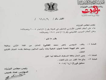 سورية الحدث أصدر رئيس مجلس الوزراء المهندس عماد خميس قرارا حصلت سورية الحدث على نسخه منه يقضي بتكليف وظيفة مدير عام الهيئة العامة للموارد المائية في سوريا الى المهندس عمر محمد الكناني. اسرة سورية الحدث تبارك للاستاذ عمر كناني ونتمنى النجاح والتوفيق له في مهامه الجديدة لخدمة الوطن والمواطن