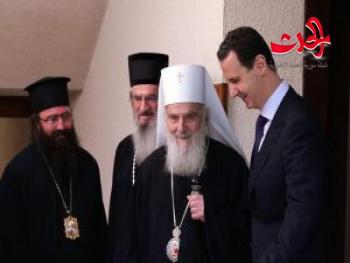 استقبل الرئيس بشار الأسد اليوم البطريرك إريناوس بطريرك صربيا والوفد المرافق له بحضور بطريرك أنطاكية وسائر المشرق للروم الأرثوذكس يوحنا العاشر يازجي.وشدد الرئيس الأسد خلال اللقاء على أن ما تعرض له البلدان من محاولات تدخل خارجية لسلبهما سيادتهما وضرب نسيجهما المجتمعي ووقوف شعبي البلدين في وجه ذلك يشكل قاعدة صلبة لبناء حوار وتعاون شعبي يؤسس لعلاقة طويلة الأمد وتخدم مصالح شعبي البلدين.من جانبه أعرب البطريرك إريناوس عن ثقته بقدرة سورية على الخروج من الظروف التي تمر بها واستعادة دورها التاريخي كدولة فاعلة في إرساء الاستقرار ونشر السلام والمحبة في المنطقة وأكد أن ما رآه خلال زيارته وما لمسه لدى الشعب السوري من عزيمة وإصرار على البقاء يداً واحدة في وجه الإرهاب عزز هذه الثقة.وثمن البطريرك إريناوس مواقف الرئيس الأسد المبدئية والقوية الداعمة لصربيا وكوسوفو فيما أكد الرئيس الأسد اعتزازه بالمواقف الإنسانية العميقة التي يتخذها البطريرك إريناوس لتعزيز قيم المحبة ونبذ التطرف.
