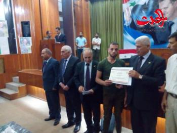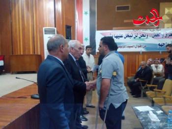 متابعة.. هيثم_علي.. أقامت نقابة الاطباء حفل لتكريم جرحى الجيش العربي السوري تقديرا لما قدموه من الغالي والنفيس في سبيل الوطن وذلك بحضور امين فرع درعا لحزب البعث العربي الاشتراكي الرفيق حسين الرفاعي و محافظ درعا اللواء محمد خالد الهنوس ونقيب الاطباء بالقطر عبد القادر حسن وأكد امين فرع درعا للحزب الرفيق الرفاعي: أن سورية “صمدت بوجه المؤامرة وحققت الانتصار على اعتى أنواع الإرهاب الذي حاول تدنيس ترابها من مختلف دول العالم وذلك بفضل قوة وبسالة أبطال الجيش العربي السوري الذي روى بدماء شهدائه وجرحاه تراب الوطن وسطر أروع ملاحم البطولة والفداء في مواجهة قوى الشر والعدوان والتنظيمات الإرهابية”. ونوه بان الانتصارات التي حققها أبطال الجيش العربي السوري “ستكتب تاريخا جديدا للإنسانية والعالم”.من جهته أوضح السيد محافظ درعا أن سورية “ماضية في محاربة الإرهاب وأدواته من مجموعات مجرمة ومسلحة بفضل تضحيات أبطال الجيش العربي السوري والقوى الرديفة والذي أصبح مدرسة تتعلم منها جيوش العالم كيفية الصمود والدفاع عن تراب الوطن” لافتا إلى أن هذا التكريم هو “تعبير عن الفخر والاعتزاز بمن يقدمون دماءهم رخيصة فداء للوطن ولأبطال نستمد منهم القوة والعزيمة”.وتحدث عن تضحيات الاطباء وما قدموه خلال الازمة التي مرت على المحافظة وصمودهم في مشفى درعا وكوادر مديرية الصحة.بدوره قال نقيب اطباء سورية إن جرحى الجيش والقوات المسلحة والشهداء “قدموا دماءهم زكية وسخية لتروي تراب الوطن وتكتب النصر المؤزر وتحكي للأجيال القادمة أنهم بذلوا الغالي والنفيس دفاعا عن سورية لتبقى وطنا للشرفاء”.واشار بان النقابة “ماضية في تكريم جرحى الجيش والقوات المسلحة في مختلف المحافظات وعلى جميع الجبهات تقديرا لبطولاتهم وتضحياتهم في الذود عن حياض الوطن”.بدورهم عبر جرحى الجيش والقوات المسلحة عن شكرهم وامتنانهم لهذه المبادرة التي تركت في أنفسهم الأثر الكبير وتشكل حافزا لهم لمواصلة الذود عن تراب الوطن والعودة لجبهات القتال حال تماثلهم للشفاء.حضر الفعالية قيادة فرع درعا للحزب واعضاء المكتب التنفيذي وعضو مجلس الشعب فواز جوابرة ومدير الصحة والخدمات الفنية ونقيب المعلمين ورئيس اتحاد العمال ...