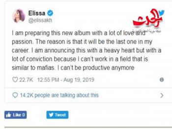 صدمت الفنانة اللبنانية إليسا متابعيها، اليوم الإثنين، باعتزالها الغناء بشكل مفاجئ، مبينةً أن الألبوم الجديد الذي تقوم الآن بتحضيره سيكون الأخير في مسيرتها الفنية.وأشارت إليسا في تغريدة على تويتر إلى أنها حزينة لإعلان هذا الخبر، إلا أنه ليس باستطاعتها أن تستمر في العمل مجدداً داخل مجال مليء بالمافيات.وكتبت إليسا: "أستعد لهذا الألبوم مع الكثير من الحب والعاطفة، والسبب أنه سيكون الأخير في مسيرتي. أعلن ذلك بقلب شديد، ولكنني على قناعة كبيرة أنني لا أستطيع العمل في مجال مشابه للمافيا. لا يمكنني أن أكون منتجة بعد الآن".يذكر أن إليسا لها الكثير من المواقف السياسية الجريئة التي أثارت عاصفة جدل على المنصات الاجتماعية.