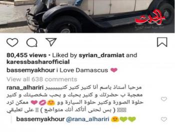 فاجأت رنا حريري، زوجة النجم باسم ياخور متابعيه على تطبيق انستغرام بتعليق طريف على صورة نشرها خلال تواجده في دمشق واجبرته على الرد بواسطة الايموجي.وعلقت حريري على الصورة التي ظهر فيها يجلس على السيارة من الخارج وقالت له: "استاذ باسم انا كثير كثير معجبة بحضرتك وكثير بحبك وبحب شخصيتك وكثير حلوة الصورة وكثير حلوة السيارة، ممكن ترد على تعليقي بس لحتى اتأكد انك متواضع ؟"بدوره رد عليها النجم السوري بوجه غاضب ايموجي مع قلوب.وقد تفاعل المتابعون بشكل واسع مع تعليق رنا الطريف، لافتين الى انها اغضبت زوجها بتعليقها بطريقة فكاهية.
