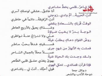 أنا شاعرٌ...قلمي يخطُّ مشاعريأنا عاشقٌ...عشقي لوصلكِ آسريأنتِ الحبيبةُ... أمُّ ولدي...زوجتي أنتِ الرَّفيقةُ... دائماً في خاطريالوقتُ قُربَكِ بالسّعادةِ ينقضيوشذاكِ يعبقُ بالأريجِ العاطرِالوجهُ بدرٌ لايغيبُ ضياؤهُعنّي ولا تنزاحُ عنهُ نواظري روضُ الفؤادِ دعاكِ يطلبُ غيثَهُفسقيتهِ غدقاً بحبٍّ ماطرِفمشت به الأنهارُ من شهدٍ جرىعسلاً محلّاً بالجمالِ السّاحرِولقد وجدت بك الحياة غنيةً بهوىً يغذي عشقَ قلبي الطّاهرِفإذا قرأتِ قصائدي... تحكي الهوى قولي أحبُّكَ..أنتَ لي...ياشاعريد.وائل جحا