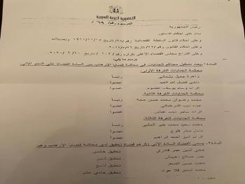وأنهى المرسوم تكليف كل من القضاة وسام بديع يزبك وريما عبد الله الرفاعي وريما أحمد يونس ومريم صافي الدغلي ومحمد علي حسين شباط وعبد الرحمن القطيني لدى محكمة قضايا الإرهاب.