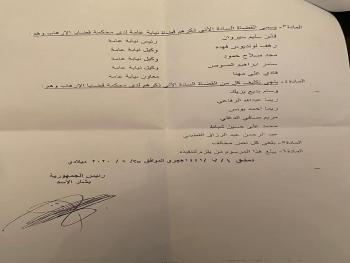 كما سمى المرسوم كل من القضاة فاتن سليم سيروان رئيس نيابة عامة ورهف لونديوس فهدة ومجد صلاح حمود وسامر إبراهيم الصوص وكلاء نيابة عامة، وفادي علي مهنا معاون نيابة عامة.