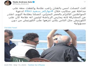 كما نشرت الإعلامية ندى اندراوس عبر حسابها على "تويتر" صورة وكتبت عليها تعليقاً إنتقدت فيه الفنان راغب علامة: "كنت اتصلت امس بالفنان راغب علامة واتفقت معه على مداخلة عبر سكايب خلال نهاركم سعيد لدعوة المواطنين الالتزام بالحجر المنزلي. اتصلنا بعلامة اليوم، اعتذر عن المشاركة لانه يمارس الرياضة ليتبين انه علامة كان على الكورنيش متل الناس يللي تنزهوا على الكورنيش من دون مسؤولية".