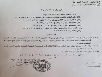 أصدر وزير التجارة الداخلية وحماية المستهلك القرار رقم 1077 تاريخ 1 – 4 – 2020 القاضي بإنهاء تكليف مدير فرع السورية للتجارة بحماة أديب الحمد من مهام وأعمال الإدارة، وتكليف رياض نايف زيود تسيير أمور الفرع المذكور ، وذلك بناءً على اقتراح من محافظة حماة.