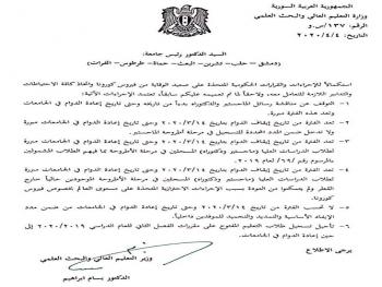 ووفقا للقرار الذي تلقت سانا نسخة منه اليوم تعد الفترة من تاريخ إيقاف الدوام 14-3- 2020 وحتى تاريخ إعادة الدوام في الجامعات مبررة ولا تدخل ضمن المدد المحددة للتسجيل في مرحلة أطروحة الماجستير.