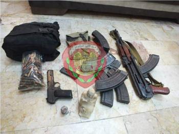 وقد ضبط بحوزة الثاني بارودة حربية مع ٨ مذخرات وذخيرتها ٢٠٠ طلقة حية ومسدس حربي مع ١٠ طلقات حية وجعبتان وتمثالان أثريان تم مصادرتها جميعاً مع سيارة كيا ريو.