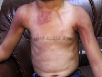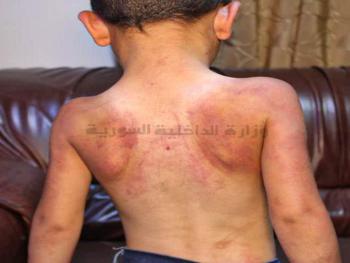 تم ارسال دورية الى منزلها الكائن في منطقة المزة خلف بساتين الرازي حيث تم مشاهدة الطفل وعليه آثار كدمات واحمرار وخدوش وجروح و آثار لحروق من جراء تعرضيه للتعذيب والضرب ، تم القاء القبض على والدة الطفل المدعوة( هند ) واحضارها الى مركز القسم وارسال الطفل الى الطبابة الشرعية بدمشق حيث تبين من الكشف الطبي اصابته ( كدمات متعددة واسعة منتشرة على الصدر والظهر والبطن والطرفين العلويين مع كدمات حول العينين وتورم بالشفة العلوية مع جرح باطني )