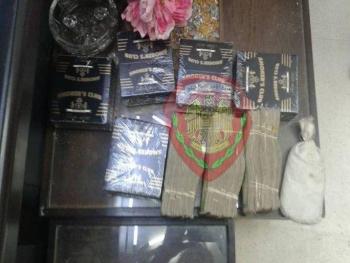 بناءً على المعلومات الواردة إلى فرع الأمن الجنائي في طرطوس حول قيام شخص بترويج مواد مخدرة ومن خلال المتابعة والمراقبة تم إلقاء القبض على المذكور على متن دراجة نارية في حي العجمي بطرطوس أثناء قيامه بترويج مادة الحشيش المخدر، تبين أنه يدعى ( خالد. ح )، وضبط بحوزته سبعة كفوف من مادة الحشيش المخدر زنة كل منها /200 / غرام ، وبالتحقيق معه اعترف بحصوله على مادة الحشيش المخدر من شخص يدعى ( خضر . ع ) مقيم في حي (المشبكة)، تم إلقاء القبض عليه وبتحري منزله عثر فيه على كف من مادة الحشيش المخدر، ومبلغ مليون وأربعمائة وسبعون ألف ليرة سورية، وبتحري سيارته عثر فيها على ثمانية عشر كروز دخان مهرب ، وسبع ماكينات حلاقة مهربة، ومبلغ تسعمائة وستة وأربعون ألف ليرة سورية.