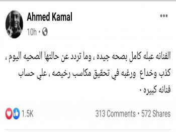 وفي التفاصيل، كتب أحمد كمال عبر حسابه الشخصي على موقع "فيسبوك": "الفنانه عبله كامل بصحه جيده، وما تردد عن حالتها الصحيه اليوم، كذب وخداع ورغبه في تحقيق مكاسب رخيصه علي حساب فنانه كبيره"، وربما يعود تصديق الجماهير لهذه الشائعات إلى قلة الظهور الإعلامي والفني لعبلة كامل خلال السنوات الأخيرة، فقد كان آخر ظهور للنجمة عبلة كامل منذ ثلاث سنوات تقريبًا في الجزء الخامس من مسلسل "سلسال الدم".