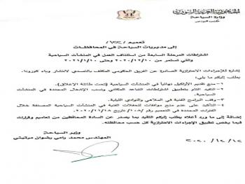 ونص التعميم على منع تقديم الأراكيل نهائياً في المنشآت السياحية، (تحت طائلة الإغلاق)، والتقيد بتطبيق اشتراطات التباعد المكاني ونسب الإشغال المحددة.