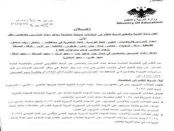 وأوضحت الوزارة في إعلانها اليوم أن التقدّم إلى المفاضلة الخاصة بمعاهد إعداد المدرسين والمعلمين عبر الرابط الإلكتروني الخاص بالمفاضلة العامة الصادر عن وزارة التعليم العالي والبحث العلمي، وفي حال عدم توافر الرابط في مراكز التسجيل المحددة من قبل مديريات التربية والتعليم في المحافظات، اعتباراً من يوم الأحد الـ 12 من تشرين الأول الجاري، حتى يوم الخميس الـ 23 منه.