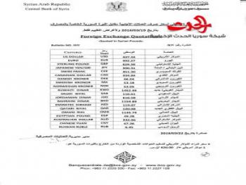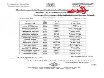 حدد مصرف سورية المركزي سعر صرف الدولار مقابل الليرة لتسليم الحوالات الشخصية بـ”420″ ليرة سورية. المصرف و وفق قائمة أسعار صرف العملات الأجنبية الصادرة عنه اليوم، حدد سعر صرف الدولار مقابل الليرة السورية بـ”437.34″ ليرة كسعر وسطي للمصارف، و “442.01” ليرة كسعر وسطي لمؤسسات الصرافة. كما حدد المصرف وفق القائمة سعر صرف اليورو مقابل الليرة السورية “492.27” ليرة كسعر وسطي للمصارف، و “497.52” ليرة كسعر وسطي لمؤسسات الصرافة، و “472.75” ليرة لتسليم الحوالات الشخصية. و فيما يلي أسعار صرف العملات الأجنبية مقابل الليرة السورية حسب نشرة مصرف سورية المركزي والذي حصل موقع سورية الحدث على نسخة منه :